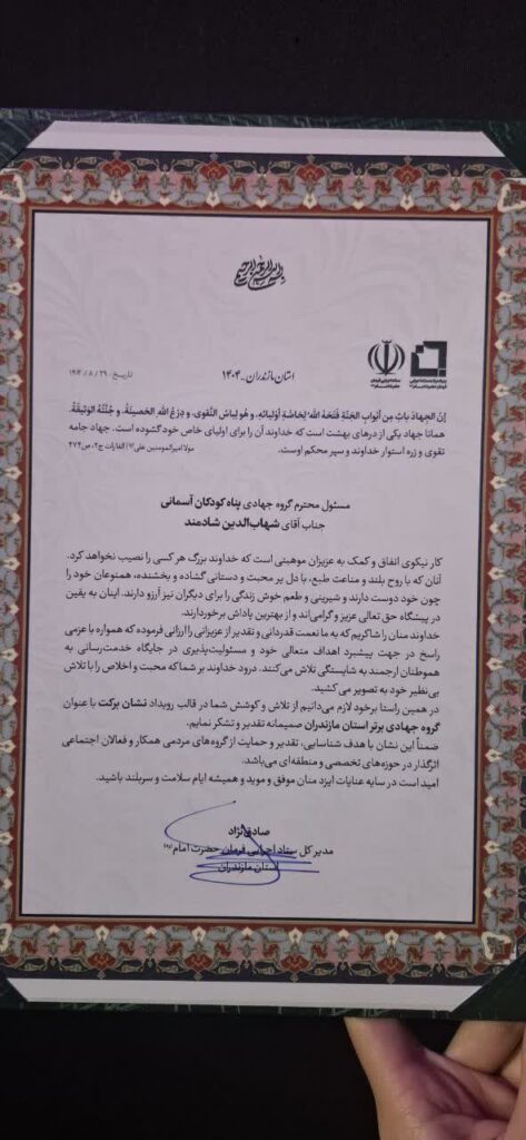 شهاب الدین شادمند مدیرعامل خیریه پناه کودکان آسمانی پس از دریافت نشان برگت بیان داشت که این نشان متعلق به تمام خیرین عزیز و همکاران عزیزمان هست که در این سالها در کنارمون بودند
